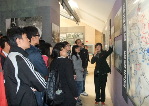 1947年5月,华东野战军在陈毅、粟裕的指挥下,经过浴血奋战,一举歼灭了国民党最精锐的部队——七十四师及其援军,孟良崮也因此役而扬名海外。当同学们走进孟良崮革命纪念基地,首先看到孟良崮革命英雄纪念碑庄严、肃穆的耸立在绿树环绕的广场上。纪念碑后面就是孟良崮革命纪念馆,展馆的外墙挂板镶嵌有194700枚弹壳,象征着战争在1947年打响。展馆共分为四部分,分别向我们展示了当时敌我兵力的悬殊,我军战术的成功以及人民群众对我军的支持。