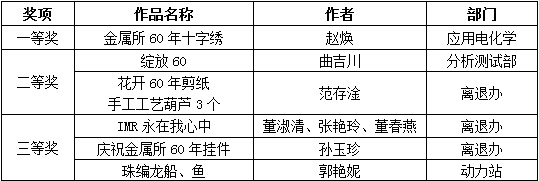为迎建所60周年,金属所于2月21日至3月15日举办了“迎所庆手工艺品制作大赛”。本次大赛共收到来自20余位作者制作的40余件形式多样的精美作品,这些参赛作品无论是创意与内涵,还是设计与做工,都充分展示了金属所职工与研究生的文化修养,抒发了对研究所的无限热爱和美好祝福。4月14日至4月28日,参赛作品在工艺楼一楼大厅展出,通过观众现场投票,最终评选出优秀作品6件,分别是: