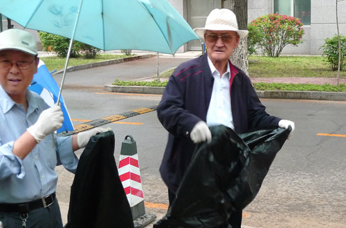 6月5日上午9:00,天空下着毛毛细雨, 60余位离退休职工志愿者提前来到离退办门前,大家几个人组成一小组,手提垃圾袋,沿着金属所南围墙,将李薰楼和工艺楼南侧花园里的石块、塑料、干树枝等垃圾捡拾起来。一个多小时的劳动结束了,大家手中的垃圾袋都装的满满的、重重的,每个人的脸上都挂满了汗水、雨水和开心的笑容。