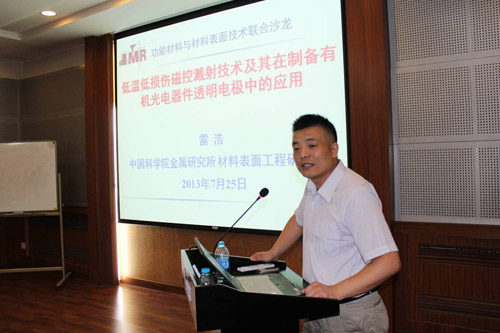 在功能材料与材料表面技术联合沙龙中,材料表面工程研究部的雷浩副研究员作了题为“低温低损伤磁控溅射技术及其在制备有机光电器件透明电极的应用”的学术报告。