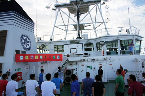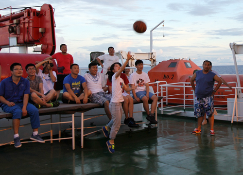 “科学”号克服海上条件限制,在船甲板的有限空间上整理出篮球场地并自制了简易篮球架,组织全体船队员开展了一次别开生面的投篮比赛。比赛分为定点投篮和限时投篮两个项目,全体船员、科考队员在保证安全和工作的前提下踊跃参与,简陋的设施与场地阻挡不了参赛队员的热情,充分展示了海洋所人不畏艰险、积极乐观的科考精神,进一步增进了船队员间的友谊,为顺利完成科考任务营造了良好的文化氛围。