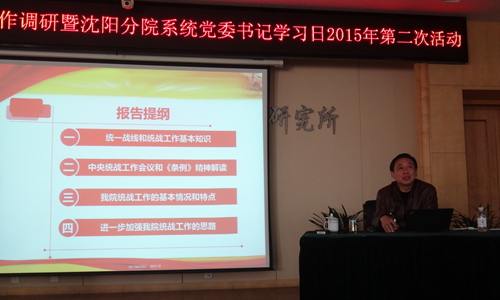 在会议上,中国科学院党组成员、副秘书长、院党建工作领导小组副组长何岩作了题为“开阔胸怀 凝心聚力 活用法宝-扎实做好新形势下的统战工作”的辅导报告。他从统一战线和统战工作基本知识、中央统战工作会议和《条例》精神解读、我院统战工作的基本情况和特点、以及进一步加强我院统战工作的思路四个方面,全面系统阐述了当前形势下统战工作的意义、思路和方法,最后对各单位党委书记开展好统战工作提出了工作要求。王启尧强调各单位党委理论中心组要加强《条例》的研究和学习,针对本单位的实际情况,对照何岩副秘书长的报告要求寻找差距,并根据工作部署抓好落实。