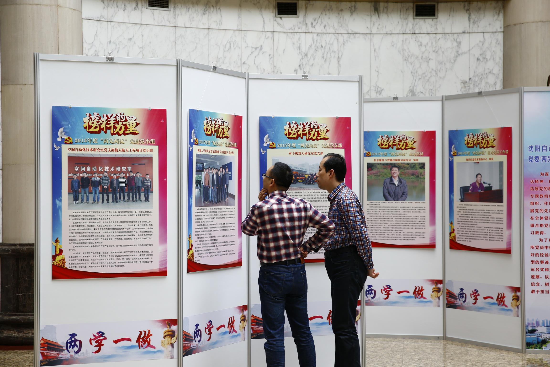 根据党中央4月6日“两学一做”学习教育工作座谈会“把合格的标尺立起来,把党员的先锋形象树起来,用行动体现信仰信念的力量”精神,沈阳自动化所举行了“创新2020”冠名奖和党委“两先两优”表彰集体和个人事迹展,号召全所同志向先进典型看齐。党办制作了立体展板在全所展出,以此在广大党员、职工中营造坚定理想信念、树立和落实新发展理念、带头攻坚克难敢于担当的良好氛围。