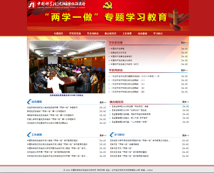 所网站开设了“两学一做”专栏,并放置在网站醒目位置。专栏内容丰富翔实,为党员进一步深入学习“两学一做”提供便捷渠道。党员可以通过专栏查看党章党规具体内容,与习近平同志系列讲话特别是其关于科技创新的论述内容,以及“两学一做”学习教育实施方案与相关通知;专栏及时更新研究所与各支部“两学一做”学习动态新闻;提供“两学一做”相关知识内容与评论文章供党员同志延伸学习;推出“身边榜样”与“全国楷模”事迹为党员树立学习榜样。