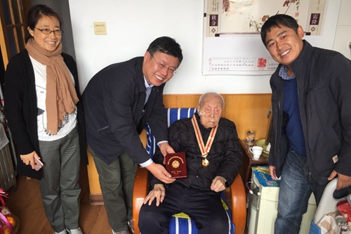 王辉副所长代表海洋所党政领导班子向白老表示亲切慰问,为白老送上中共中央、中央军委颁发的“中国工农红军长征胜利80周年纪念章”,与白老亲切握手交谈,详细了解了白老的生活起居、身体健康状况,并代表所党委祝愿白老生活愉快、健康长寿。白学光同志对海洋所党政领导多年来的关心和照顾表示感谢。