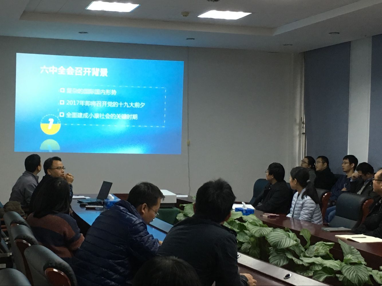 周功克书记带领大家一起学习了《六中全会为全面从严治党开创新局面》的报告,对十八届六中全会的意义、内容、展望等方面进行了详细生动的解读,周书记号召大家要坚定理想信念,始终相信、依靠人民群众,为实现中华民族伟大复兴做贡献。之后,全体党员观看了首都师范大学马克思主义教育学院原院长李松林同志做的关于“两学一做”,强化学习意识,争做合格党员的视频报告。