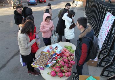 早晨7:30,活动在所正门前拉开帷幕。本次活动主要分为两个环节,首先是参与活动的女生现场关注DICP研究生会微信公众号并留言写下自己的心愿,便可领取研究生会精心准备的爱心水果一份,200份“爱心”分批送出,送完为止;然后是在留言的女生中随机抽取10名幸运女生送出丰厚的幸运大礼包,并将留言女生的心愿在微信公众号中进行推送,等待着有心的“他”来实现。