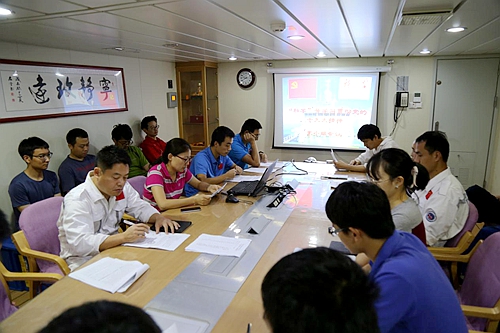 11月9日,正在西太平洋执行国家基金委西太平洋开放航次任务的“科学”号科考船召开学习十九大精神和南仁东先进事迹座谈会。本航次来自中科院海洋所、华东师范大学、厦门大学、同济大学等10家单位的全部24名党员参加了学习座谈。