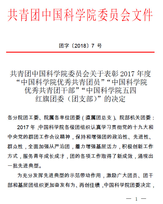 为深入学习贯彻党的十九大和共青团十七届七中全会精神,充分发挥先进典型的示范带动作用,调动基层团组织的积极性、主动性和创造性,中国科学院团委在“五四”期间开展了2017年度“两红两优”评选表彰活动。海洋研究所团委副书记王家栋获“中国科学院优秀共青团干部”荣誉称号,博士研究生宋浩获“中国科学院优秀共青团员”荣誉称号,全院共有48名团干部及97名团员获得表彰。