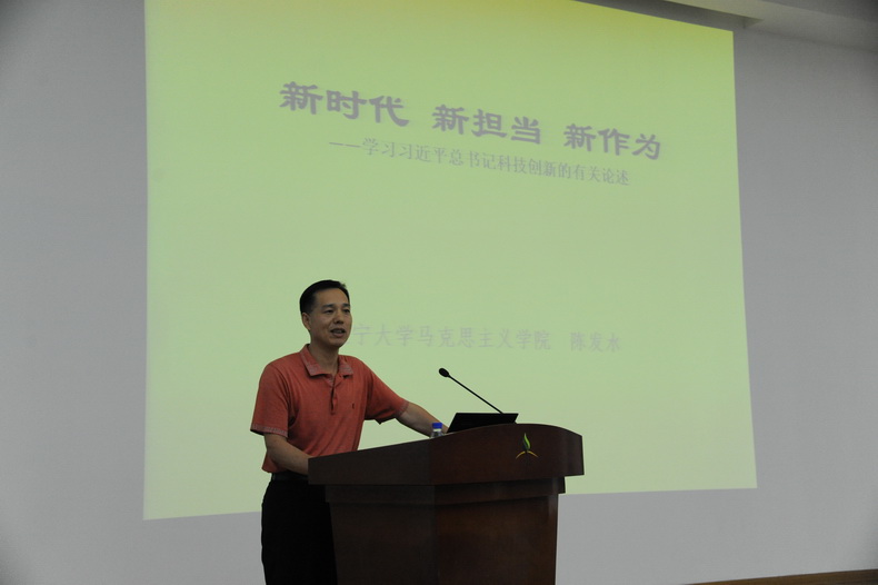 报告中,陈发水首先分析了习近平科技创新思想形成的历史背景,他认为习近平科技创新思想是基于世界历史与近代中国屈辱历史深刻反思的结果,是捍卫国家主权的客观需要,是综合国力的重要显示度的表现,也是实现“两个一百年”奋斗目标的客观要求。随后他阐述了习近平科技创新思想的主要内容,包含创新是引领发展的第一动力;实施创新驱动发展战略,推进以科技创新为核心的全面创新;.科技创新是提高社会生产力和综合国力的战略支撑;坚定不移走中国特色自主创新道路;加快科技体制改革步伐;牢牢把握科技进步大方向;牢牢把握产业革命大趋势;牢牢把握集聚人才大举措等八个方面。报告最后,陈老师讲述了新近印发的《关于进一步激励广大干部新时代新担当新作为的意见》的主要内容,包括大力教育引导干部担当作为、干事创业,鲜明树立重实干重实绩的用人导向,充分发挥干部考核评价的激励鞭策作用,切实为敢于担当的干部撑腰鼓劲,着力增强干部适应新时代发展要求的本领能力,满怀热情关心关爱干部,凝聚形成创新创业的强大合力等建立激励机制和容错纠错机制的七个举措。陈老师的报告主题鲜明,紧跟大局、逻辑清晰、论证深入,具有很强的理论性、政策性和针对性,对我们深入学习领会习近平科技创新思想,对贯彻落实《关于进一步激励广大干部新时代新担当新作为的意见》有积极意义。