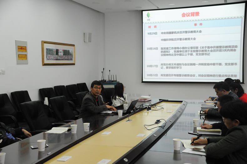 为了进一步促进广大党员、职工对党中央全面开展警示教育深刻意义的认识,在10月17日向各党支部和广大党员以文件形式传达中国科学院警示教育大会精神的基础上,10月22日,中国科学院沈阳应用生态研究所组织召开传达院警示教育活动精神学习传达会,研究所党委委员、纪委委员、党(总)支部书记、中层干部参加会议?;嵋橛缮蜓羯澄榧墙鸩苤鞒?。