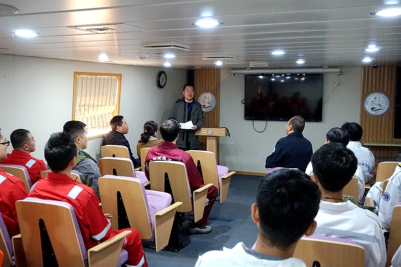 毕伟副书记宣读了《中共中国科学院海洋研究所委员会关于成立“科学”轮1901航次“海上堡垒”临时党支部的决定》,李雷溪同志任航次临时党支部书记,航次首席科学家宋永东任组织委员兼纪律委员,“科学”号轮机长姜良优任宣传委员兼统战委员。