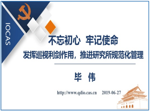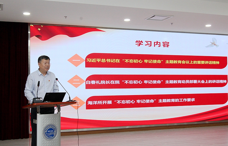 中科院“不忘初心、牢记使命”主题教育第八指导组组长马思同志发表讲话,介绍了指导组的工作职责、工作内容以及如何开展工作,对海洋所开展“不忘初心、牢记使命”主题教育认真部署、注重海洋科技特色、结合实际讲求成效,初步进展顺利,给予了肯定,并对如何开展下一步工作提出了指导意见和具体要求。他强调,要继续按照中央、中科院党组、沈阳分院分党组、山东省委和青岛市委的任务部署和时间节点,结合研究所工作实际,按照本单位上报的主题教育工作计划和方案,统筹做好相关工作,传承好老一辈优秀共产党员和老一代杰出科学家的初心,努力落实“三个面向”“四个率先”要求,担负起新时期海洋强国建设的战略使命,不断为建设海洋强国作出新的更大的贡献。