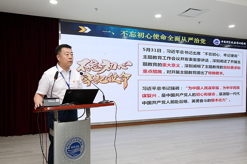 王辉同志作了《守初心 担使命 找差距 抓落实》的主题教育专题报告。他从“习近平总书记在‘不忘初心、牢记使命’主题教育会议上的重要讲话精神”“白春礼院长在院‘不忘初心、牢记使命’主题教育动员部署大会上的讲话精神”“海洋所深入开展‘不忘初心、牢记使命’主题教育的工作方案与要求”三方面进行了详细解读和推进部署。他强调,全所党员特别是党员领导干部要切实提升政治责任感,把开展“不忘初心、牢记使命”主题教育作为重大政治任务抓紧抓实抓好,与推进“两学一做”学习教育常态化制度化结合起来,与深入实施“率先行动”计划结合起来,与推动中科院海洋大科学中心建设和两所融合工作结合起来,与研究所开展的提升基层党组织的组织力有关工作结合起来,确保主题教育取得扎实成效,更好地支撑服务创新驱动发展战略和海洋强国建设,以更加优异的成绩迎接新中国成立70周年、建院70周年和建所70周年。