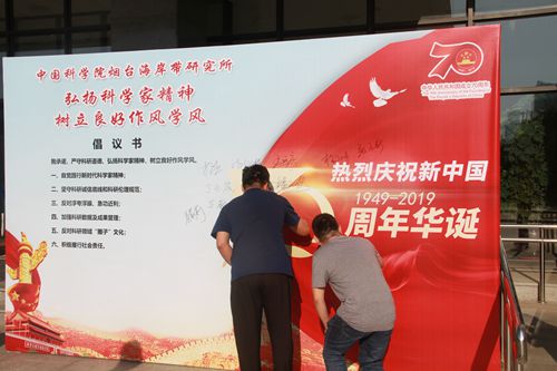 9月27-30日,在祖国70年华诞来临之际,为大力弘扬科学家精神,教育和引导科研人员树立良好作风学风,中国科学院烟台海岸带研究所党政领导班子成员、职工、研究生近200人郑重签名,承诺“弘扬科学家精神、树立良好作风学风”,表达了作为科技工作者坚定科技报国的决心和信念,并向祖国献上祝福。