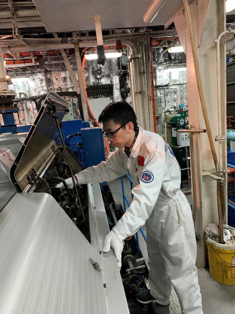 支部委员、实习轮机长陶传波对主发电柴油机进行检查