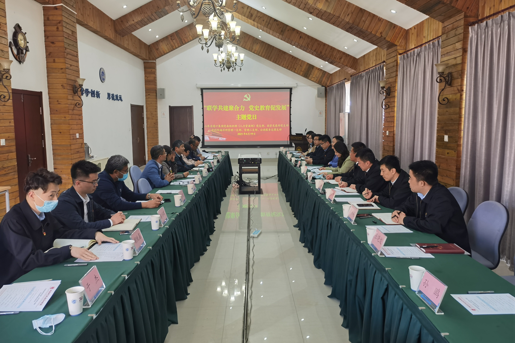 为深入开展党史学习教育,增强基层党组织活力,发挥党员的先锋模范作用,4月19日,海洋所管理一、二党支部和公共服务支撑与学会党支部,联合山东省港口集团党委组织部(人力资源部)党支部、投资发展部党支部开展“联学共建聚合力 党史教育促发展”主题党日暨迎接建党100周年主题联建活动。山东省港口集团工会主席/党委组织部(人力资源部)部长高亚、投资发展部部长吕晓丽,海洋所人力资源总监程培周、党委委员/运管中心支部书记李雷溪、党群工作处处长展翔天、管理二支部书记孟庆勇、工会常务副主席徐纯青等40余名党员参加共建活动。