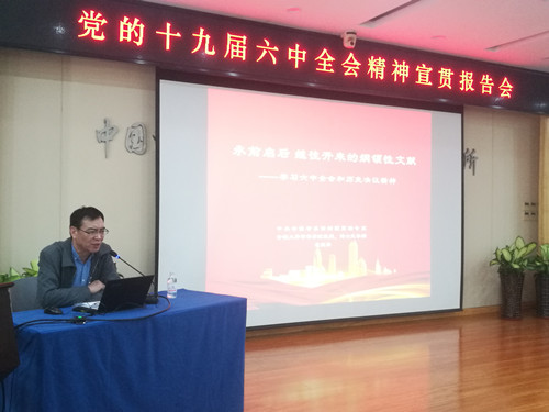会议邀请到中共安徽省委讲师团高端专家、安徽大学哲学学院教授、博士生导师裴德海做《承前启后 继往开来的纲领性文献——学习六中全会和〈决议〉精神》专题报告。裴德海教授从“六中全会的议程和重大意义”“《决议》的主要内容”“全面贯彻落实六中全会精神”三个方面对党的十九届六中全会精神和《决议》进行了全面宣讲和深入解读。报告主题鲜明、内容丰富,脉络清晰、思想深刻,对全面理解和把握党的十九届六中全会精神具有重要的指导作用。
