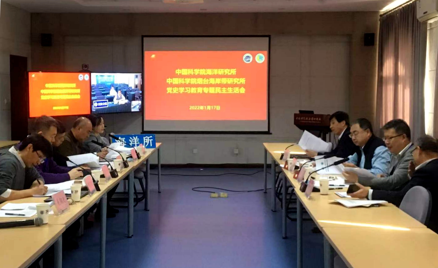 1月17日下午,中科院海洋所、烟台海岸带所联合召开党史学习教育专题民主生活会。中科院党史学习教育第十三指导组因新冠疫情防控原因以视频会议形式参会指导。两所领导班子全体成员参加会议,海洋所党委书记王辉主持会议。