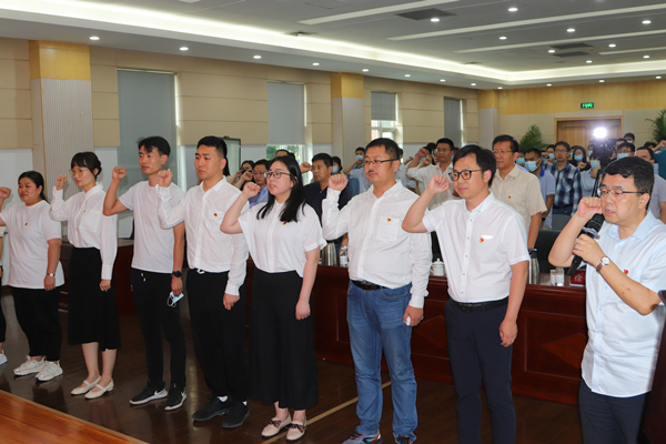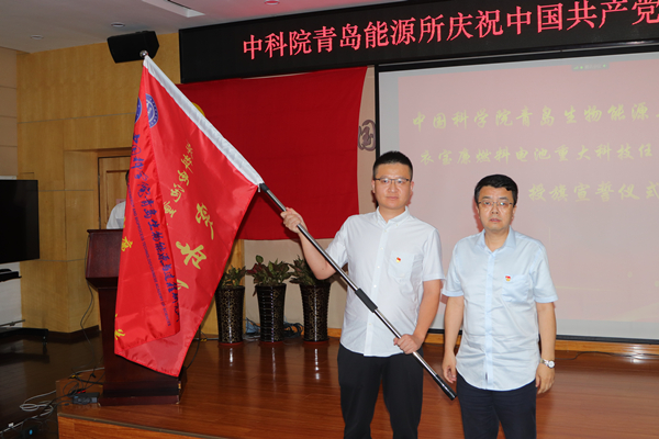 徐峰向大会宣读了所党委《关于成立衣宝廉燃料电池重大科技任务攻关突击队的通知》,彭辉向突击队授队旗,突击队队员面向党旗、队旗庄严宣誓,表达了为建设世界科技强国贡献力量的信心和决心。
