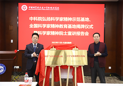 首先,金玉奇和张玉奎共同为大连化物所获批的全国科学家精神教育基地和中国科学院弘扬科学家精神示范基地揭牌。