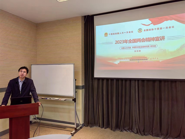 随后,全国人大代表孙东明同志作“2023年全国两会精神宣讲”主题报告。他介绍了2023年全国人民代表大会的概况、习近平总书记在大会期间的重要讲话精神、各项工作报告和议程的主要精神、代表团活动情况及个人履职情况。孙东明表示,在参会过程中聆听了习近平总书记的重要讲话,非常振奋人心,触动很大,强烈感受到党中央对科技创新的高度重视,全国两会后,自己通过会议座谈、新闻媒体等积极宣传全国“两会”精神。孙东明指出,作为科研一线的全国人大代表,是党和国家给了自己荣誉和责任,将一如既往认真履职尽责,在推动科技自立自强,推动党中央重大决策部署贯彻落实,反映和推动解决科研人员关心关注的问题方面继续发挥作用,不辜负全国人大代表的光荣使命。