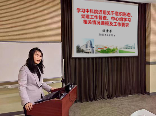 会上,汤素芳首先作了题为“学习中科院近期关于意识形态、中心组学习、党建工作督查相关情况通报及工作要求”的主题报告。她指出,要认真对照中科院对相关工作提出的要求,检查我所存在的不足,不断加强和改进我所意识形态和思想政治工作,充分发挥中心组学习成果对实际工作的指导作用,进一步提升研究所党的建设质量,为重大科技成果产出提供坚强的政治和组织保障。