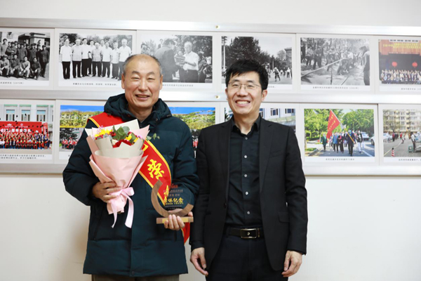 卓君臣向新退休职工代表侯万良研究员发放“荣休纪念牌”