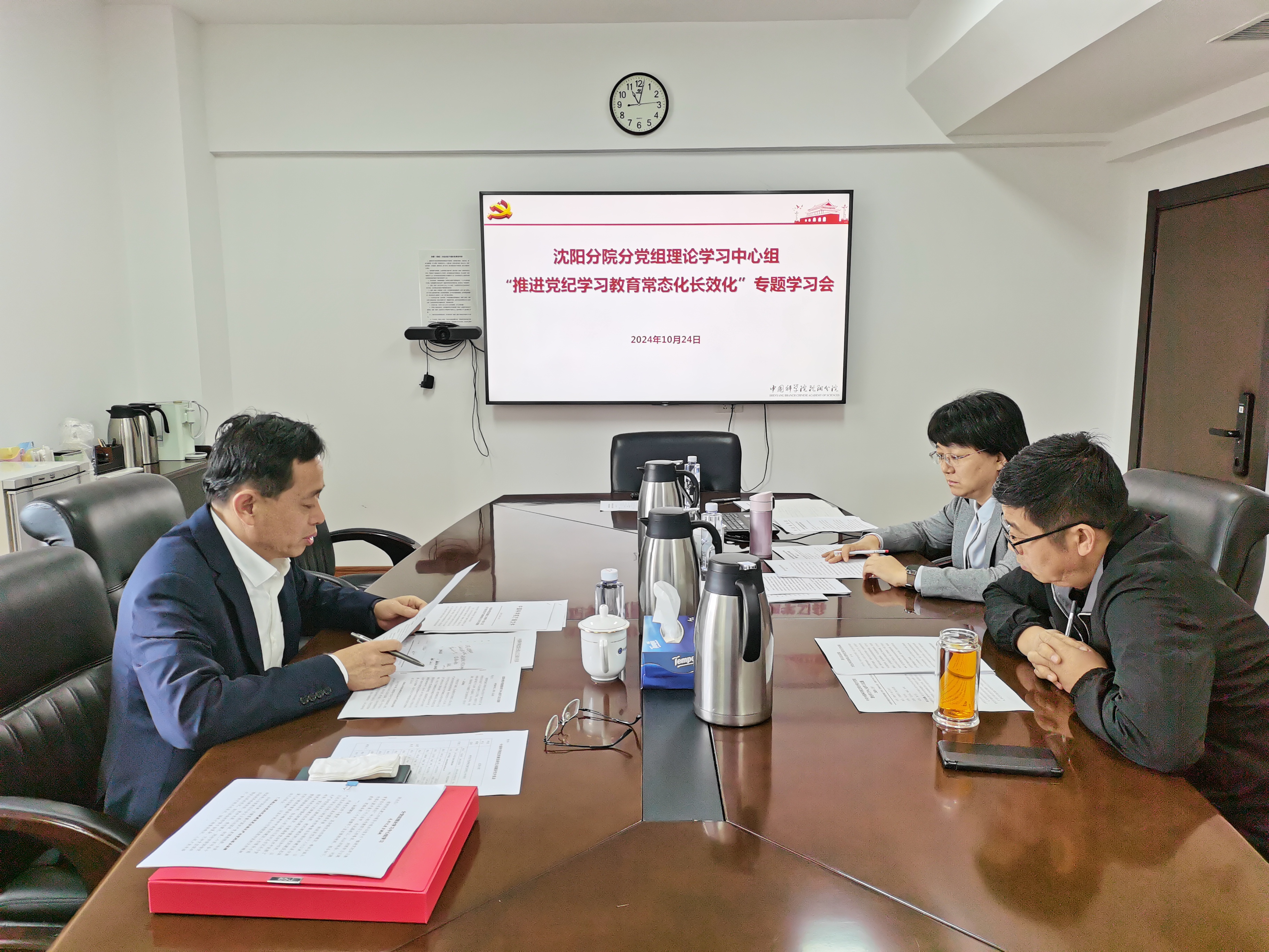 按照院党的建设工作领导小组办公室要求,10月24日,沈阳分院分党组理论学习中心组召开“推进党纪学习教育常态化长效化”专题学习会,分党组书记、院长毛志远,分党组副书记杨宏,纪检组组长、分党组成员李明参加会议。