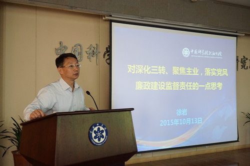 为提高分院系统各单位纪委书记和纪监审干部的责任意识、担当精神,理清工作思路,用好工作抓手,徐岩作了《对深化三转、聚焦主业,落实党风廉政建设监督责任的一点思考》的主题报告。徐岩指出,从思想认识上,系统各单位纪委和纪监审工作部门在深入理解中央纪委有关深化三转、聚焦主业工作要求的基础上,要结合中科院纪监审工作要求和各单位实际创造性开展工作,纪监审干部特别是纪委书记要加强学习、系统思考、顶层设计、狠抓落实、敢于担当。从工作举措上,要认真推进“两个责任”落实、扎实推进风险防控和制度建设、扎实做好内审监督工作、认真做好纪律审查和责任追究工作、做好反腐倡廉宣传教育、努力营造单位廉政文化、加强纪监审队伍建设和基础性工作。徐岩还要求各研究所要认真落实好院党组2011年10号文件对纪监审工作机构、人员、纪委书记分管工作、投入精力等方面的各项要求,有关单位领导班子和职能部门等机构调整的要及时重新补签个性化责任书,要及时完善本单位纪监审工作规范,通过认真梳理和思考确保完成今年工作任务,谋划好明年工作,并就做好沈阳分院直属单位纪委的工作提出了要求。