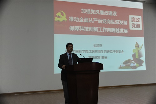 为深入贯彻落实党的十八届六中全会精神、中纪委十八届七次全会精神,加强研究所党风廉政建设,为新的一年科技创新工作良好开局切实发挥保驾护航作用,3月16日上午,中国科学院沈阳应用生态研究所党委书记金昌杰在多功能厅作了题为“加强党风廉政建设,推动全面从严治党向纵深发展,保障科技创新工作向跨越发展”的专题报告,为沈阳生态所全体党员、职工上了一堂廉政党课。沈阳生态所班子成员、党委委员、纪委委员、在编人员、离退休、研究生党支部书记近180人参加本次报告会。
