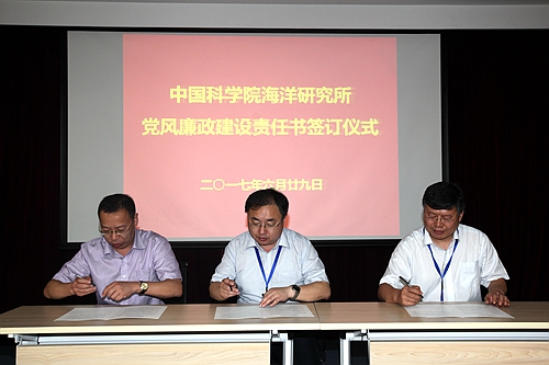 6月29日上午,在庆祝建党96周年暨2016-2017年度党建工作表彰会议上,海洋研究所举行了党风廉政建设责任书签订仪式。所长王凡、党委书记王辉、副所长李超伦、纪委书记毕伟出席签订仪式,科研、管理与支撑骨干人员等150余人参加仪式。仪式由副所长李超伦主持。