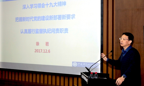 沈阳分院分党组副书记、纪检组组长徐岩作了《深入学习领会十九大精神,把握新时代党的建设新部署新要求,认真履行监督执纪问责职责》的主题发言,从十九大报告中关于党建方面的内容概览、对新时代党的建设新部署新要求的理解、“数”说十九大报告中有关党建的内容、新党章有关党的纪律和纪检机关新提法、贯彻十九大精神做好沈阳分院系统纪检工作的思考五个方面进行了系统全面的学习解读。?