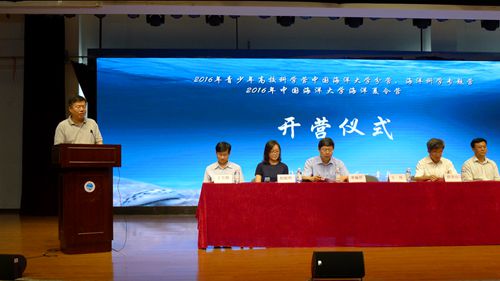 开营仪式在中国海洋大学崂山校区举行,中科院海洋所副所长王辉、中国海洋大学副校长李巍然、山东省青少年科技活动中心主任薛念山、青岛市科协副主席徐冰等出席仪式。王辉副所长在致辞中对营员们的到来表示欢迎,希望大家在一周的活动中能够开阔眼界、启迪智慧、收获友谊,在探索海洋奥秘过程中感受海洋科学的魅力,并祝愿大家度过一段难忘的科学之旅??鞘浇崾螅泄蒲г涸菏克挝⒉ń淌谧髁颂馕段夜嗣嫜У难芯坑虢埂返淖ㄌ饨沧?。