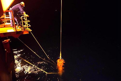 有了第一次下水的经验,第二次下水工作变得轻车熟路。工程技术人员开动吊车、A架,下放设备,科考队员安装取样管、调试设备,配合相当默契。