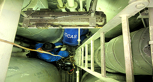 上面这幅照片拍摄于机舱烟囱内部,我拍摄的位置似乎已经很高了,可是还要再爬3个这么高的楼梯才能够走出烟囱,到达甲板。里面像一个风洞,温度却很高。作为轮机长,我最怕的是决策失误,让同事们白白流血流汗。正如今天,为了检查和疏通4台发电机组烟管消音器上的放残管路,他们已经忙活了5个小时,汗如雨下,衣服仿佛淋过大雨一样。他们要在烟囱里沿着那个90度的梯子上下6~7层,把好不容易拆下的被烟灰堵塞的管路和阀件搬运出去,然后清理疏通干净再运回来装复,这种难度是可以想见的。而我最欣慰的是,今天的决定是正确的!我的工作安排总是可以得到同事们的认同并被努力完成,哪怕困难重重,没有埋怨,只有执行。这让人想起二战的故事,“把信交给亚细亚”,而在这个部门,他们都是“罗文中尉”!
