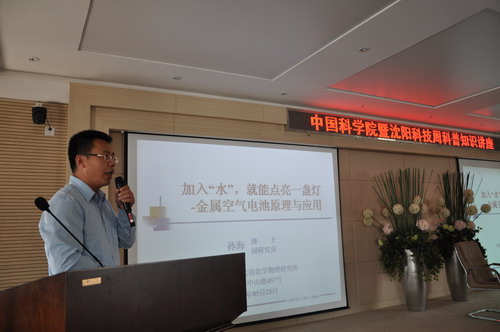 5月23日,在沈阳市第二十四中学、第一二七中学的报告厅里,一种新型应急电源盒子里加入盐水,就能点亮一盏节能灯,还能给手机充电。中科院大连化学物理研究所孙海副研究员为大家送去了两场精彩的科普报告《加入“水”就能点亮一盏灯—金属空气电池的原理与应用》。