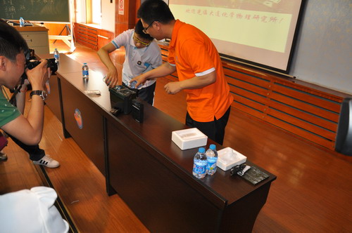 在报告会上,孙海为同学们介绍了金属空气电池的工作原理、特点优势以及做为应急储备电源在5.20 四川芦山抗震救灾中的实际应用情况,并现场与同学们共同演示操作,使同学们真实地了解了这种电池的工作原理和操作方法。
