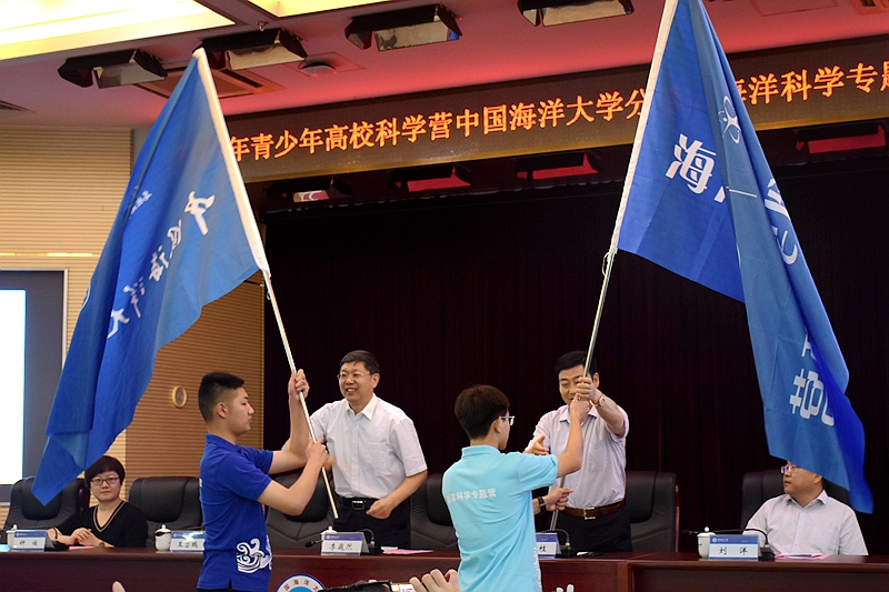仪式上,李巍然、刘岳桂共同为青少年高??蒲вQ罂蒲ёㄌ庥?、中国海洋大学分营营员代表授旗,刘岳桂宣布开营。