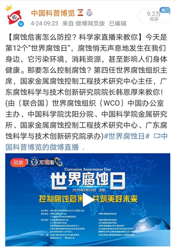 2020年4月24日是第12个“世界腐蚀日”,为提升社会公众对腐蚀和腐蚀控制的认识和了解,科学普及腐蚀学科在经济和生活中的重要作用,“世界腐蚀日”网络科普活动在沈阳举办,活动由(联合国)世界腐蚀组织(WCO)中国办公室主办,中科院沈阳分院、中科院金属研究所、广东腐蚀科学与技术创新研究院联合承办。本次网络科普活动通过中国科普博览微博现场直播,共1.9万网友在线收看。