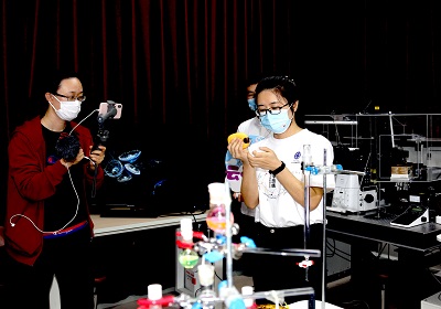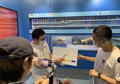 “硬核展馆来了!带你穿梭DICP70年!”场次中,主播通过对大连化物所走过的重要历史足迹的回顾和对张大煜和张存浩两位先生的感人事迹的讲述,抒发了研究所以国家需求为导向,锐意创新、协力攻坚的精神与情怀?!白呓澜缟献盍恋募贤夤庠础⑷鲜痘繁S胧称钒踩南确嫖朗俊背〈谓樯芰舜罂蒲ё爸么罅庠吹谋尘?、原理和应用,通过形象生动的互动展示了仪器分析在食品、环境、安全等领域的应用。在“闪闪荧光点亮细胞”场次,主播通过美丽神奇的荧光现象的展示,带观众走进了分子探针和荧光成像下的奇妙生命世界。在“来分子反应动力学国家重点实验室,给分子原子拍照片、拍电影”场次,通过对飞秒、纳米等概念的讲解和对飞秒实验室和扫描隧道显微镜等仪器设备的观察,让观众了解了科学家如何捕捉微观世界的反应过程。