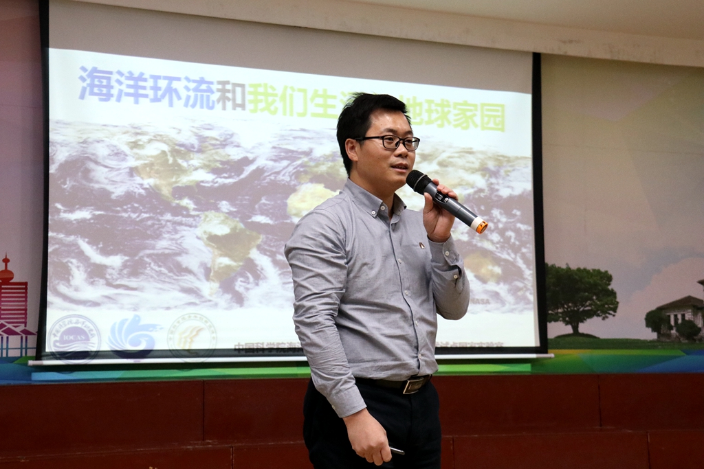 胡石建研究员为全体师生作了题为“海洋环流和我们生活的家园”的海洋科普报告。胡石建研究员从直观熟知的小问题入手,如地球是什么颜色、地球与月球有什么不同等引出海洋的重要性,通过生动的图片和动画带领学生们搭上海洋环流知识的奇妙旅程。孩子们乘着“海洋环流”过山车从南极漂到北极,从非洲漂到南美洲,穿过丛林、越过山脉,领略了海洋环流的重要性和神奇魅力。胡石建研究员通俗易懂地介绍了从古至今人类对海洋环流的测量方法和现代化的观测技术,把严肃深奥的科学研究转化成生动有趣的演绎。学生们提出了很多有趣的问题,胡石建研究员与现场100多位小学生进行了热烈的交流讨论。