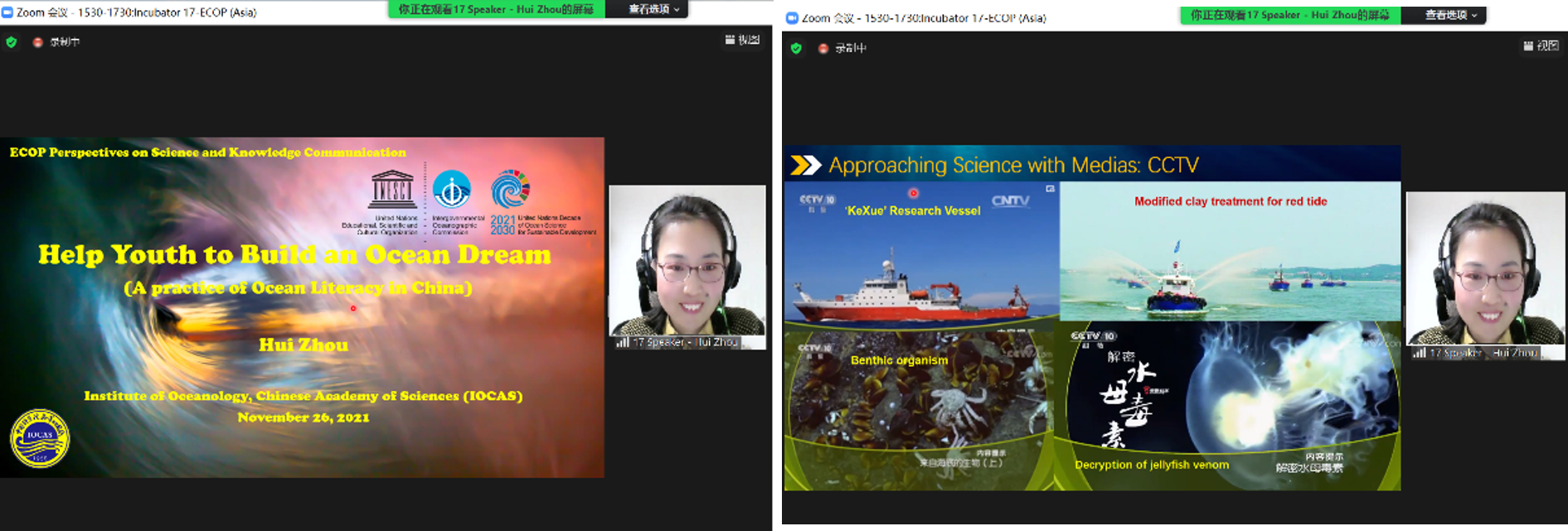 在会上,周慧博士代表海洋所作了题为“帮助青年一代构筑海洋梦” (Help Youth to Build an Ocean Dream)的报告。周慧博士详细介绍了海洋所多元化、创新性的海洋科普工作及丰富的海洋科普教育资源,并结合自身在科普工作中的实践、感悟,向与会者展示了海洋所近些年在海洋科普工作中取得的工作成果,传递了海洋所致力于高端科研资源科普化宗旨和海洋科普国际化的理念,得到了与会者的一致认可,期待海洋所将来能为联合国“海洋十年”未来海洋人才储备和强化大众海洋意识作出积极贡献。海洋所王琳博士作为ECOP亚洲工作组的核心成员,在会上探讨了该工作组面临的机遇和挑战。