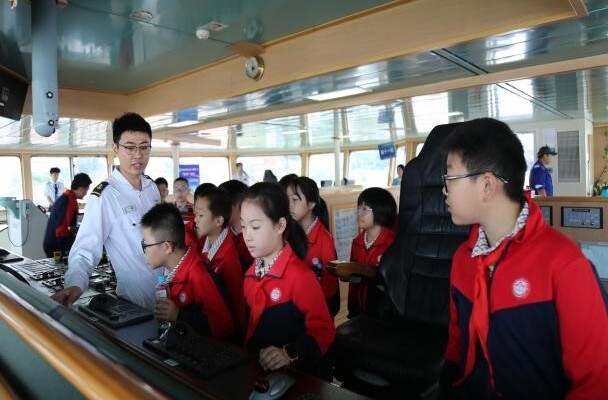 中小学生参观“科学”号驾驶台