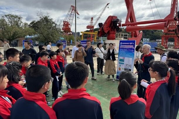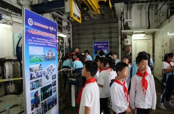 中小学生和市民参观“科学”号后甲板作业区