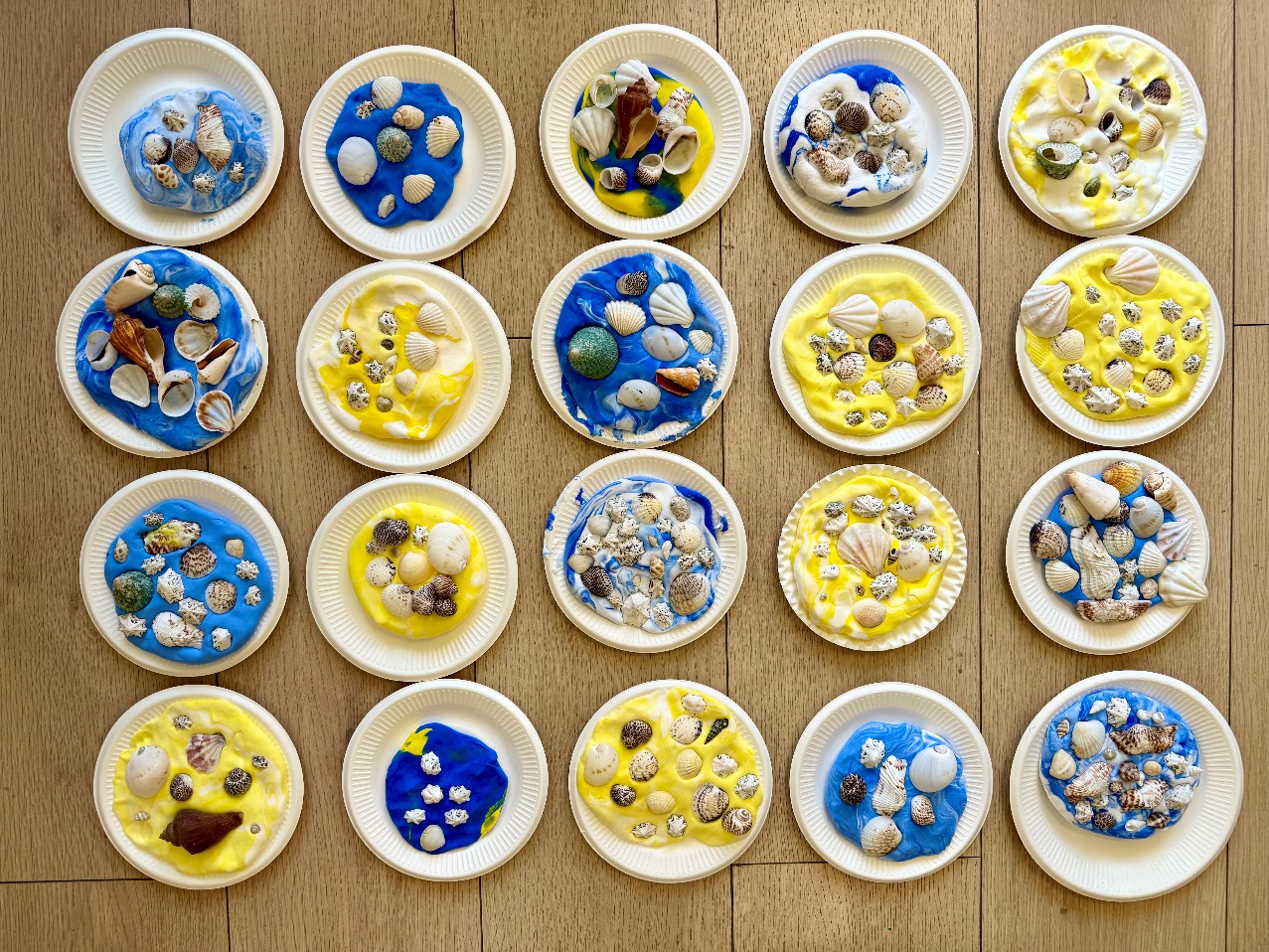 讲解之后,王琳洁老师为孩子们准备了精美的海洋动物贴纸,指导孩子们用各式各样的海洋贝壳和粘土制作“我心中的海洋”贝壳工艺品。通过手工制作,孩子们进一步加深了知识的理解,培养了独立思考、积极动手的好习惯。