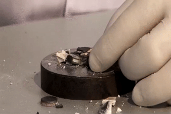 然后将这些只剩下碳元素的头发结晶放入液压机,接受高压的洗礼。