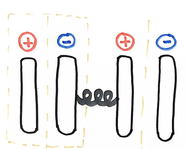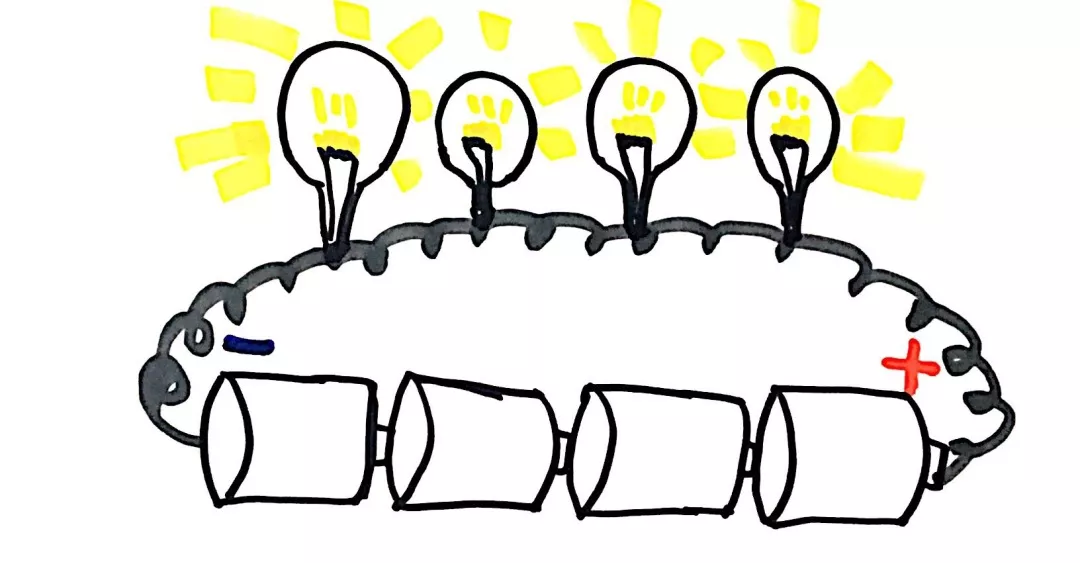 “如果简单地把两个电池串联,我们可以用一根导线连接相邻电池:”