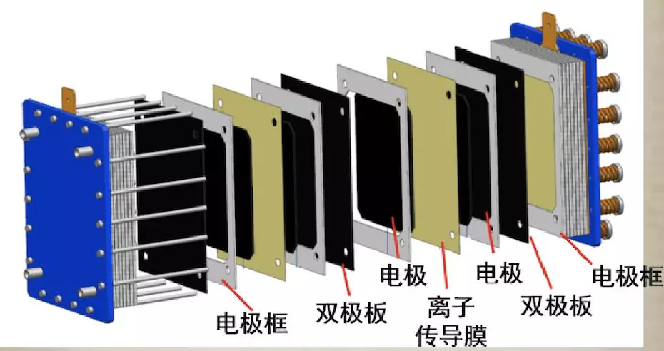 “它确实是单电池串联而成的。只不过不是通过导线简单地串联。电堆通过一个叫“双极板”的东西实现单电池的串联:”