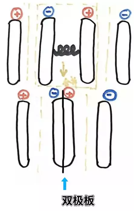 但是如果要串联很多单电池,这样做就太麻烦了,我们可以用一块导电板替代导线,导电板一面与正极接触,另一面与相邻单电池的负极接触,所以称之为双极板;工作时,电子通过双极板直接传导至相邻单电池,这样既节省了空间又缩短了电子的传导路径,降低了电池的内阻。
